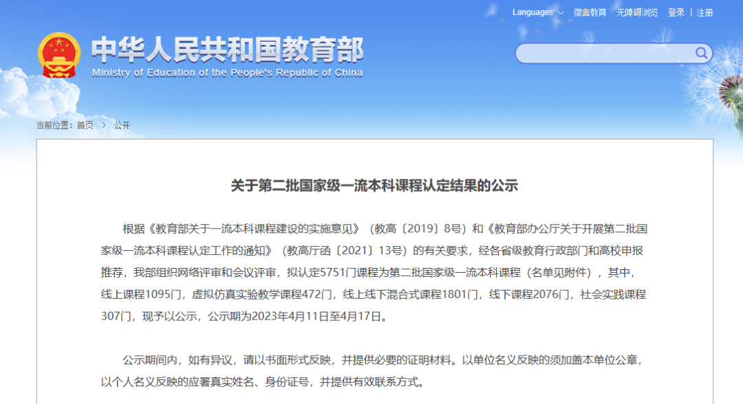2023年4月,教育部发布《关于第二批国家级一流本科课程认定结果的公示》,无码av