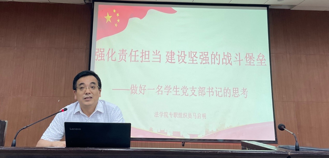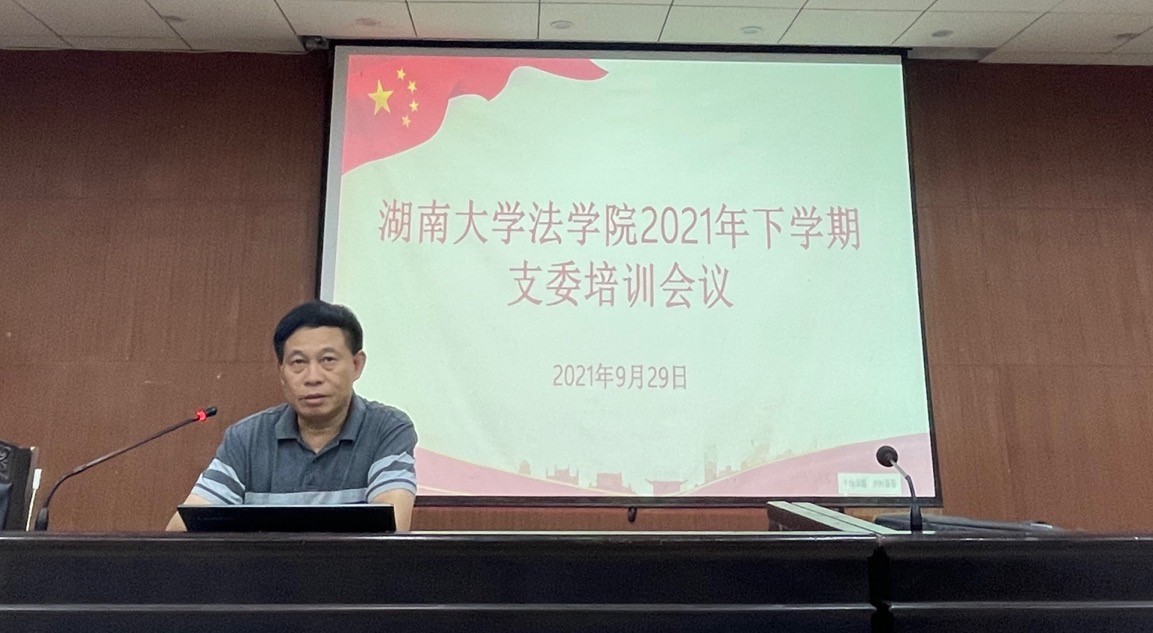 2021年下学期学生党支部支委培训会议在模拟法庭举行。院党委书记易骆之,党委副书记、纪委书记罗英,副处级组织员马启明出席会议并讲话,学院23个学生党支部全体支委参加培训,会议由党务干事成凤仪老师主持。