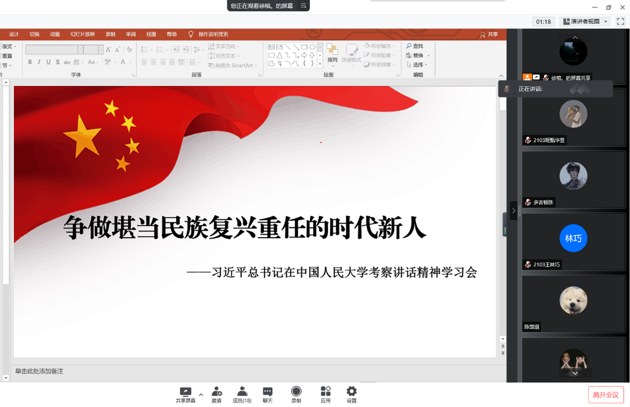 2103班在线上腾讯会议召开以“争做堪当民族复兴重任的时代新人”为主题的专题学习活动。会议由班级团支书徐榕主持。